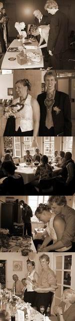 Feier bei uns Daheim: Zum Mittag hatten wir am Abend vorher eine Tomatensuppe gekocht, die es jetzt mit Baguette gab. Christians Zimmer war ebenfalls am Tag zuvor total verwandelt wurden. Wir hatten es ausgeräumt und Biergarnituren reingestellt, die sich Dank Ankes Nähkünsten und Kathrins kreativer Ader nur noch schwer als solche erkennen ließen. Die Deko war einfach toll!!! Ich war nicht dabei, als die Mädels dekoriert hatten und als ich nach Hause kam, dachte ich, ich traue meinen Augen nicht! Nach dem kleinen Imbiss wurde allen ein bisschen Erholung gegönnt bis wir uns auf den Weg in einen nahegelegenen Park für die Gruppenfotos machten. Während des anschließenden Spaziergangs hatten unsere tüchtigen Freunde ein bisschen Zeit, die Tische für das Kaffeetrinken herzurichten. Die Kuchen waren allesamt Spenden unserer Gäste und wir schnitten Kathrins stellvertretend als Hochzeitstorte an (keine Ahnung, wer welche Hand wo hatte...). |